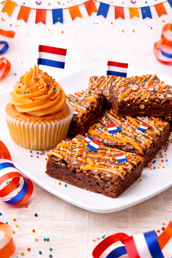 Zowel de cupcakes als de brownies worden feestelijk versierd in oranje & rood-wit-blauw 🇳🇱